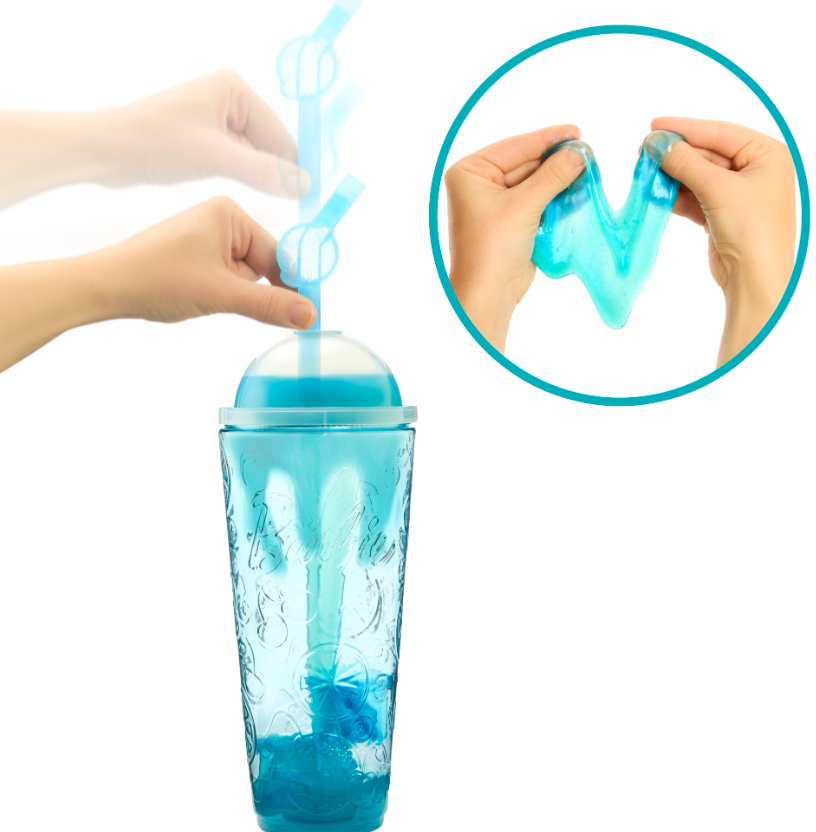 Wyjmij slime i ściskaj go do woli, ciesząc się sensoryczną zabawą. Potem otwórz "kostki lodu", aby odkryć wrotki i miękki "mininapój".
