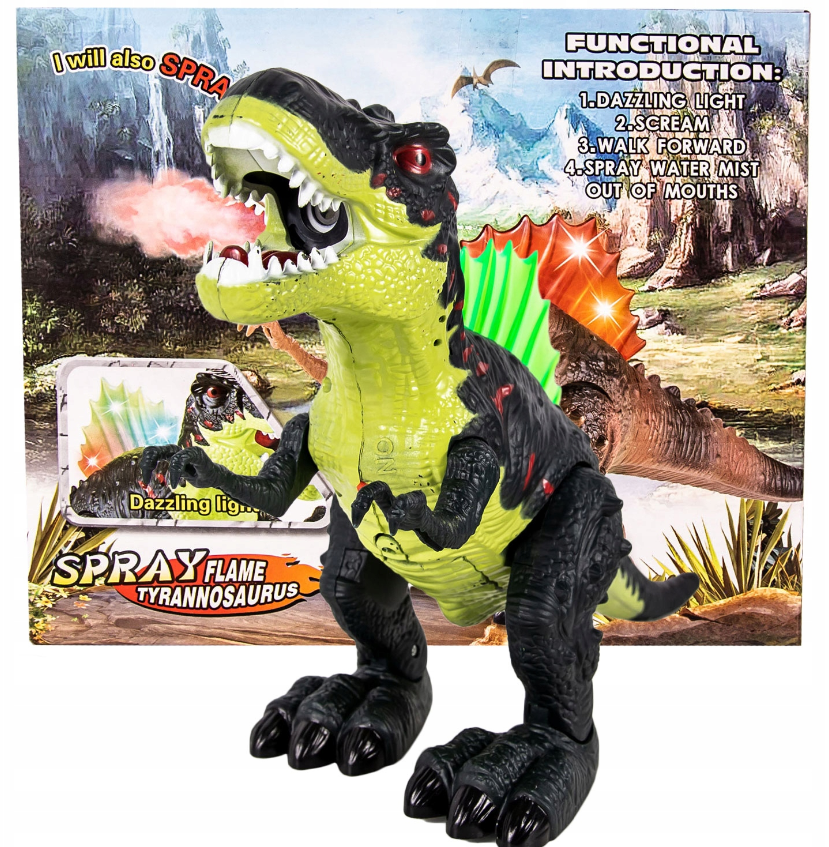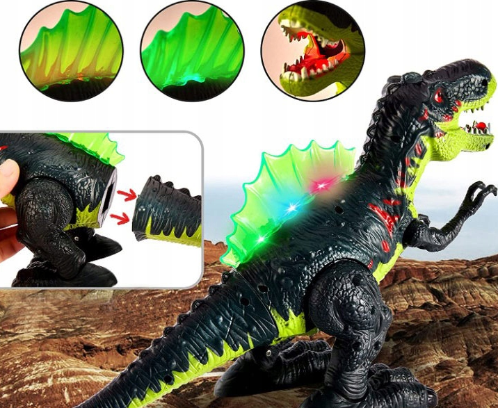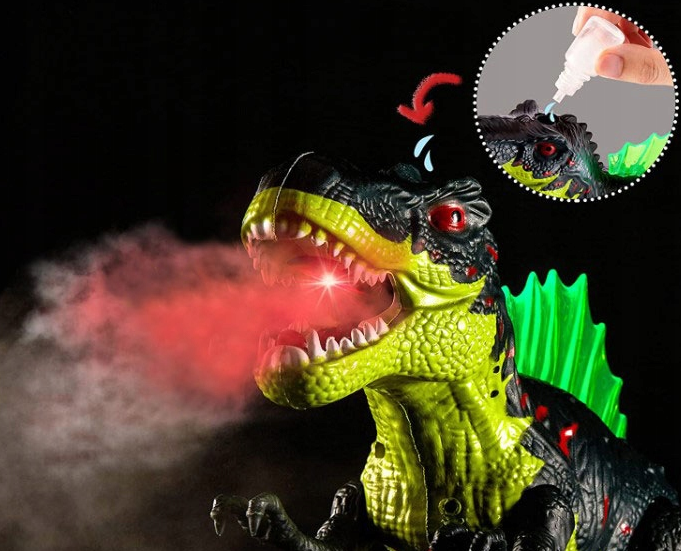 Po włączeniu dinozaur chodzi, wydaje dźwięk ryczenia, świeci mu się grzbiet i dymi z paszczy.