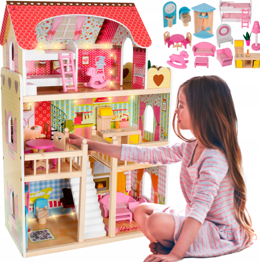 Domek dla lalek drewniany XXL z mebelkami i oświetleniem LED – marzenie każdej dziewczynki!