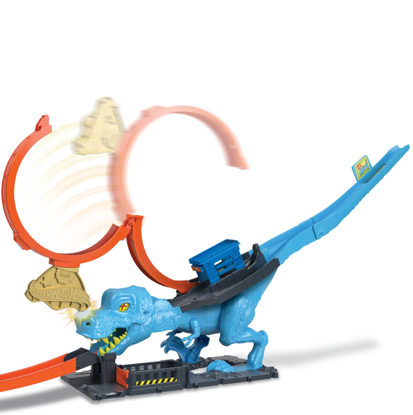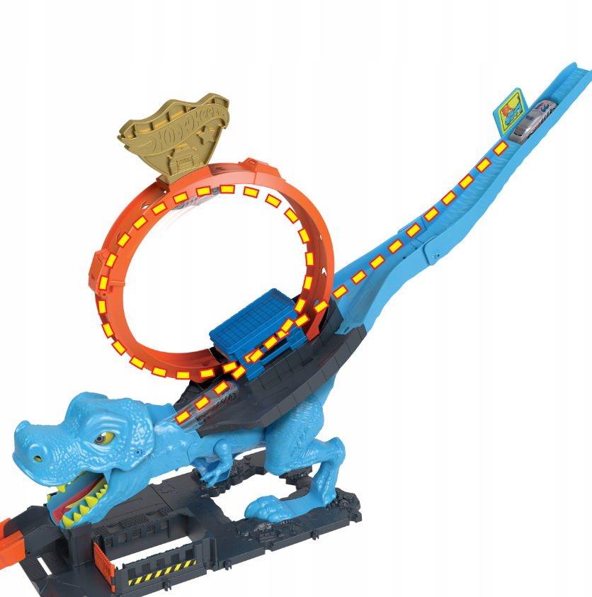Przejedź przez paszczę potężnego T-Rexa, który próbuje zniszczyć miasto Hot Wheels™! Odpowiednio wyceluj, aby przewrócić drapieżnika i ocalić miasto.Umieść dołączony samochodzik Hot Wheels® w posterunku policji, naciśnij wyrzutnię i popędź przez pętlę do strefy starcia.Gdy dinozaur padnie pokonany, jego ślepia zmienią się z rozwścieczonych na oznaczone symbolem X.Tor łączy się z innymi zestawami, pozwalając Ci stworzyć własny świat Hot Wheels™ City. (Dodatkowe zestawy sprzedawane oddzielnie).