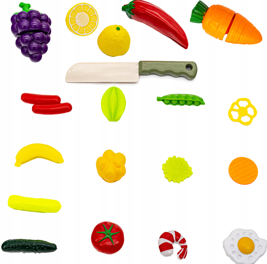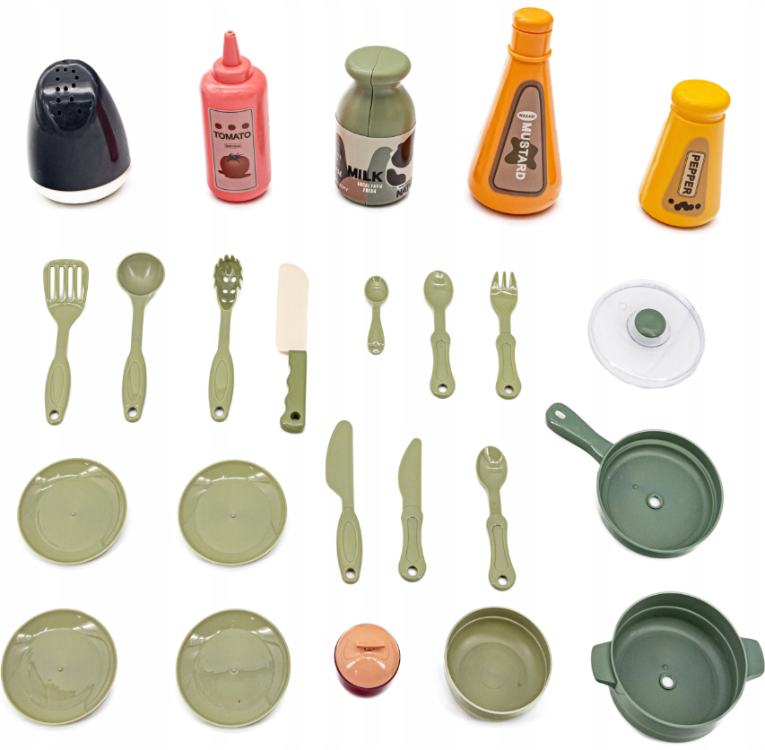 Do dyspozycji małej gospodyni/gospodarza jest cała gama naczyń, garnków i sztućców. Nie zapomniano również o warzywach, owocach czy opakowaniach kartonowych imitujących produkty spożywcze.