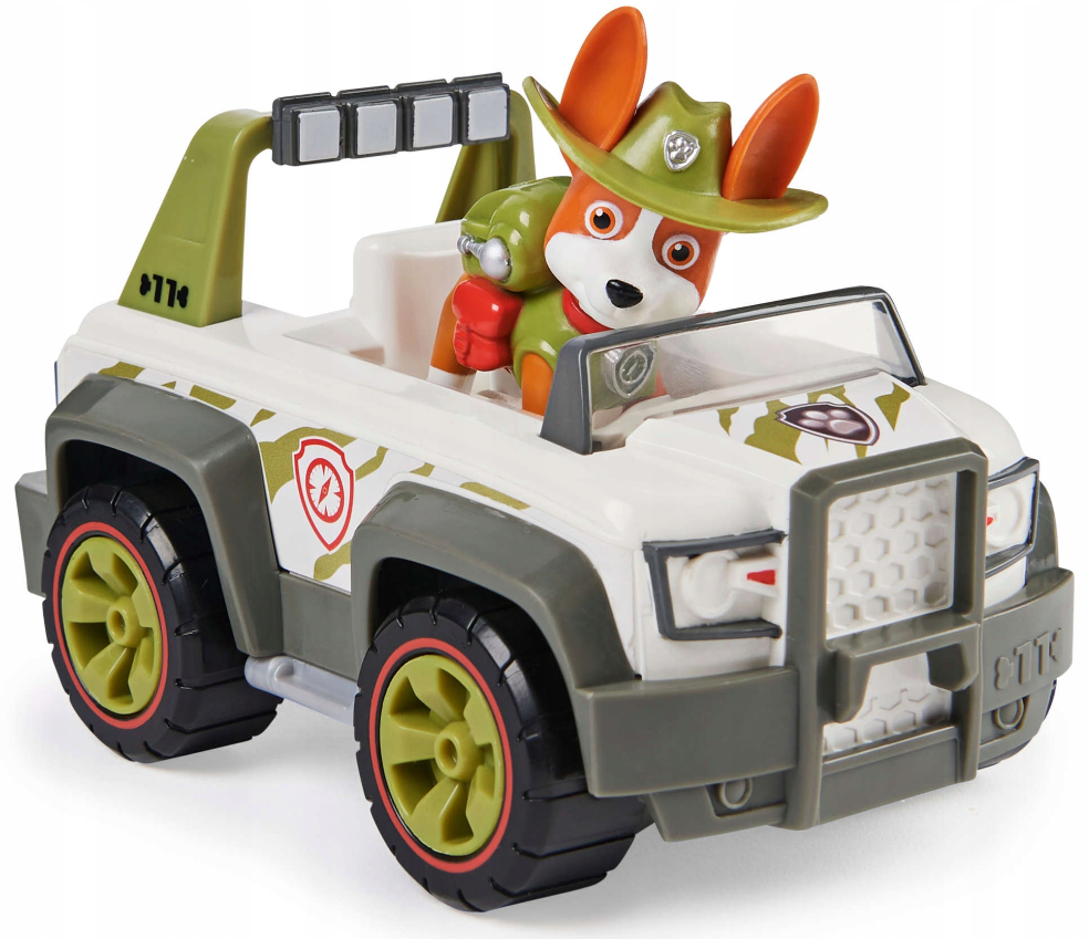 - Figurka wiernie odzwierciedlająca pieska Trackera, rasy Canine, który jest nowym bohaterem Psiego Patrolu. Ma sierść w kolorze brązowym, biały pyszczek i łapy. Ubrany jest w zieloną kamizelkę i kapelusz. Szczeniaczka można umieścić na miejscu kierowcy.