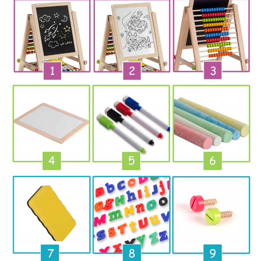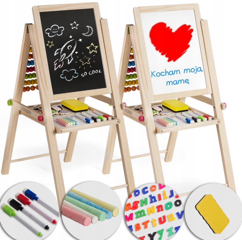 TABLICA DWUSTRONNA Z LICZYDŁEM DLA DZIECI MAGNETYCZNA KREDOWA + AKCESORIA