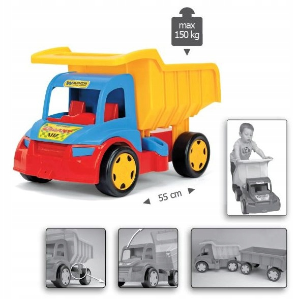 Gigant Truck wywrotka to ogromny samochód. Ma aż 55 cm długości i ponad 36 cm wysokości, a jego udźwig wynosi 150 kg . Dzięki temu, oprócz zwykłej zabawy ciężarówką, Gigant Truck daje nowe możliwości. Można go używać jako pchacz przy nauce chodzenia. Dziecko może także usiąść w wywrotce i sobie pojeździć. Tak mocna konstrukcja pozwala puścić wodze fantazji. Wywrotka jest bardzo bezpieczna, dlatego można ją podarować nawet rocznemu dziecku i może posłużyć nawet przez kilka lat.